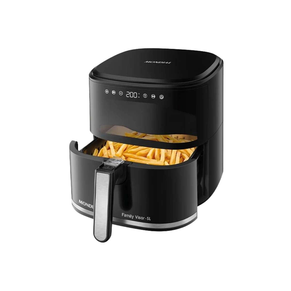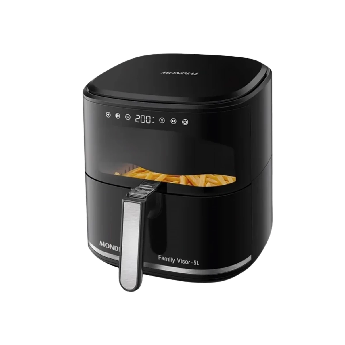 Cocina saludable para toda la familia paraguaya. 5 litros caben 1.5kg de papas fritas o pollo entero. Freí sin aceite: usa aire caliente circulante. Timer de 60 minutos con apagado automático.